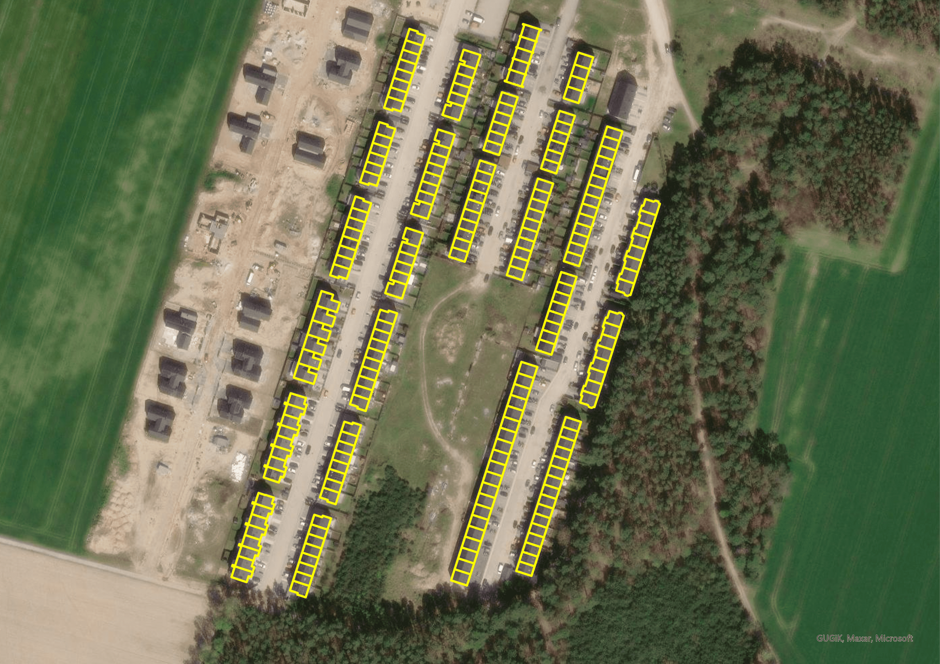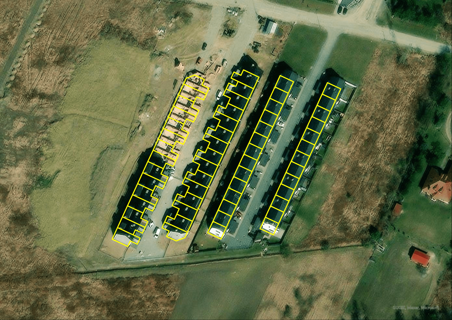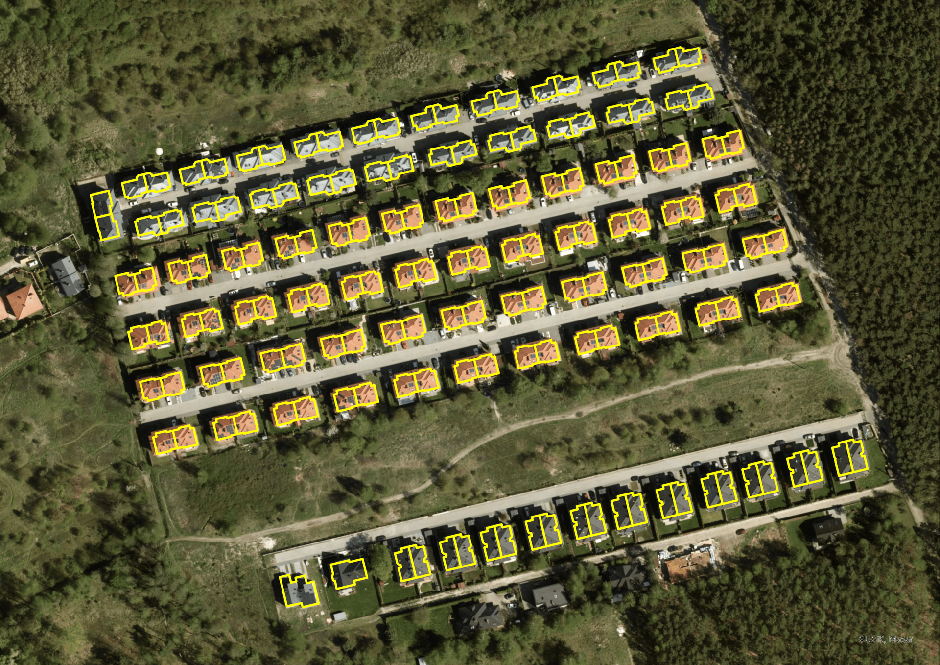 Przykłady budynków w "zabudowie łanowej" wykryte przez algorytm