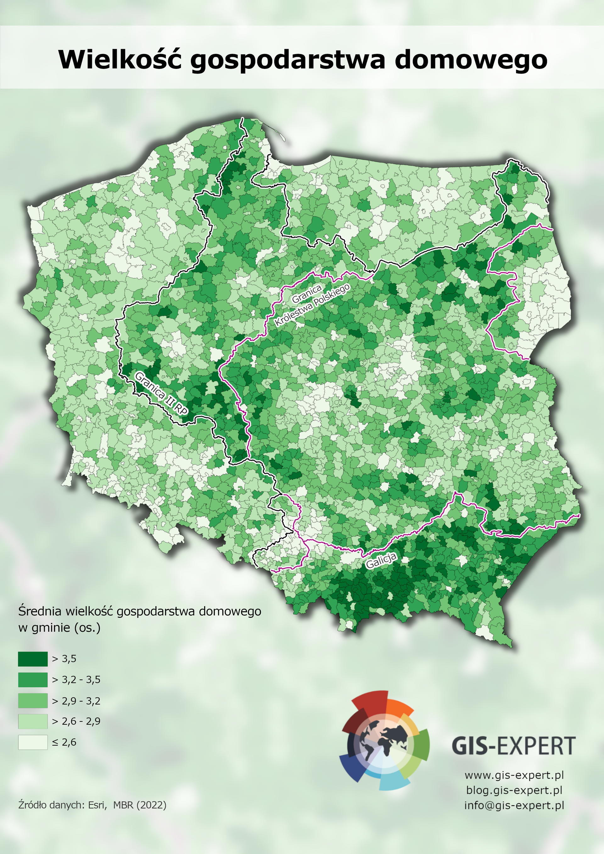 W analizie struktury gospodarstw domowych należy zwrócić uwagę na różnice między obszarami wiejskimi a miejskimi. Na mapie widać, że w dużych miastach gospodarstwa domowe są najmniej liczne - jest tak np. w Warszawie (średnio 1,9 osoby) oraz Sopocie, Wrocławiu i Krakowie (średnio 2 osoby w gospodarstwie domowym). Wśród regionów z niską przeciętną liczbą osób w gospodarstwie domowym wyróżnia się również wschodnia część województwa podlaskiego. Po drugiej stronie skali znajdują się gminy, w których średnia wielkość gospodarstwa domowego przekracza